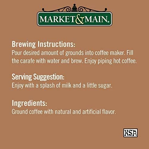 Enjoy the delicious taste and inviting aroma of Market & Main Chocolate Peanut Butter Cup flavored coffee. Guilt free indulgence with less than 10 calories per serving if prepared without cream and sugar. There is no gluten used in the manufacturing of the coffee. 100% coffee with natural and artificial ingredients. Kosher certified.